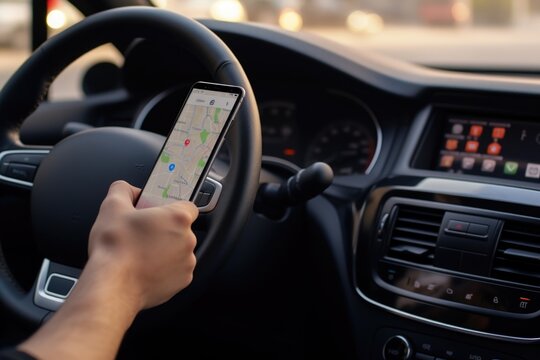 A person focused on using a smartphone while driving on a busy road highlighting the risks of distracted driving in a modern urban environment