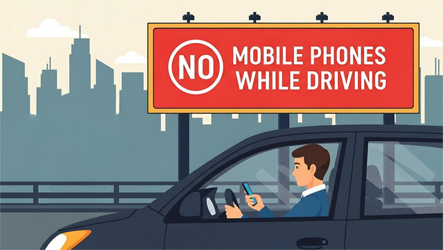 A person texting while driving under a large “No Mobile Phones While Driving” billboard