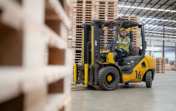 Man working at warehouse and driving forklift