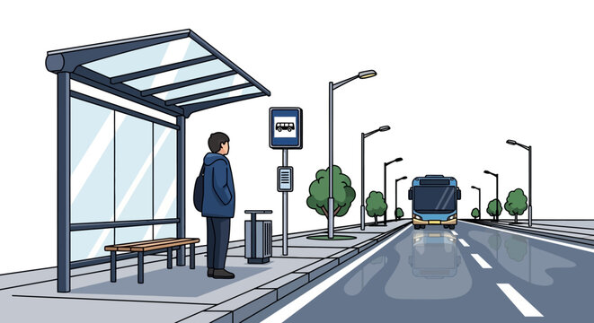 Illustration of a man waiting at a bus stop on a city street with a bus driving by and a clean white background.