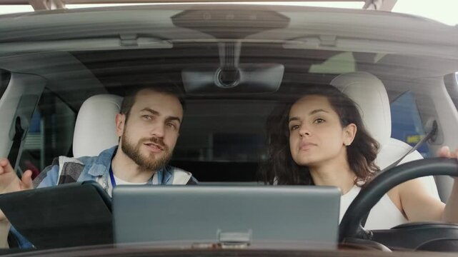 Lady listening her male instructor while studying in driving school. Slow motion