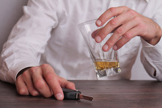 Don't drink and drive concept. Close up of man hand drinking wine and holding car keys. Responsibly and safety driving