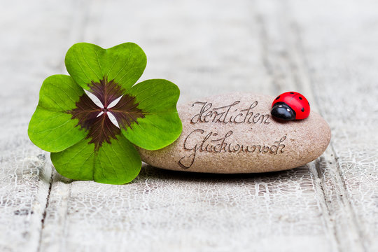 Glücksbringer mit Stein auf Holz, Herzlichen Glückwunsch