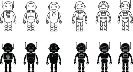 Retro robot character silhouettes set, vintage droid icons in outline and solid styles, cartoon AI machines vector collection