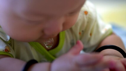 close-up, sick girl coughing, drool flying out of her open mouth, white bokeh in the light, dust, germs, outdoor allergies