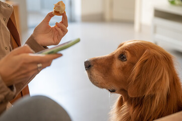 Golden Retriever looking at the food in his hand drooling