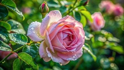 A delicate, once-beautiful rose wilts, its petals drooping and fading to a soft pink, surrounded by lush green foliage and subtle morning dew.