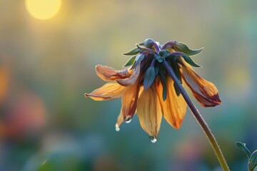 A drooping flower regains life as a single water droplet revitalizes its wilting petals, symbolizing hope and renewal