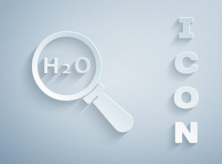 Paper cut Chemical formula for water drops H2O shaped icon isolated on grey background. Paper art style. Vector Illustration.