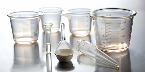 Macro shot of delicate measuring cups and droppers on white backdrop