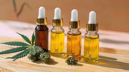 CBD droppers with marijuana leaves around, product photography, alternative medicine, Cannabidiol