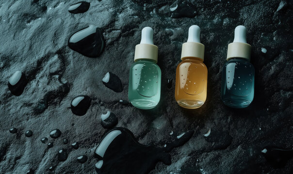 serum bottles with droppers on a dark wet slate background, ideal for skincare products and cosmetic industry promotions