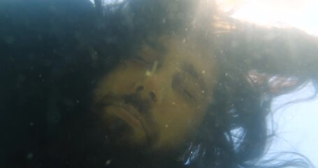 Close-up underwater shot of a  long-haired man  in black clothes lying in the water and drowned surrounded by jellyfish. The concept of lost hope and suicide. 4k slow motion