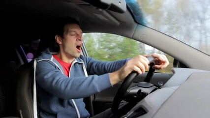 Tired driver to sleep behind the wheel. Sleeping driver, emergency dangerous situation on the road. Unwell, sick car driver. Vector illustration, flat design cartoon style.