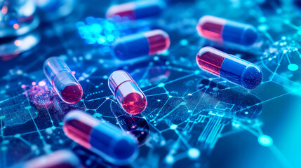 Molecule structure illustration on blue. Chemical compound model shows atom connections. Represents medical research tech, nano sci, innovative drug form, cellular biotech, skin hydratation with