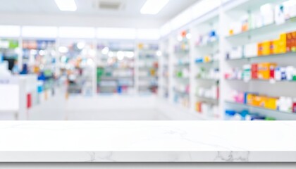 Empty white marble counter top with blur pharmacy drugstore shelves background