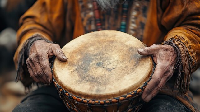 Traditional African Drums in a Circular Arrangement, showcasing unique textures on a wooden floor, emphasizing craftsmanship and cultural heritage in a clean, open setting