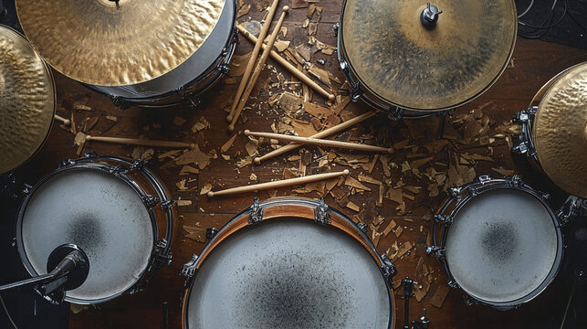 Musician performing on a drum set during a rehearsal session in a music studio, showcasing focus and passion for music. The environment suggests a creative space for musical expression.