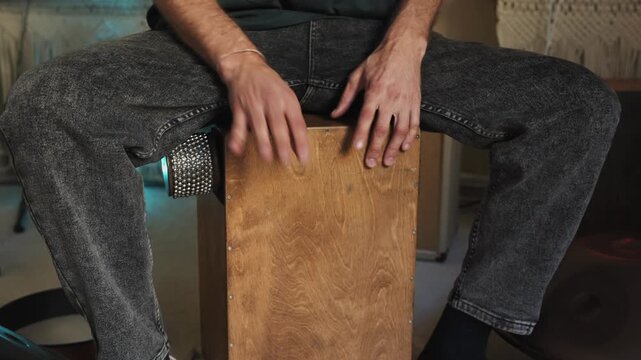 Close-up of hands playing djembes in a drumming session, wooden drums with rope tuning, warm indoor background, concept of music and cultural expression. Ai generative