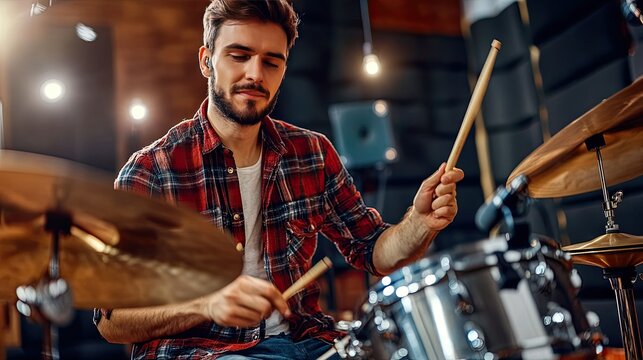 A young male drummer holding a golden ride cymbal, partially shielding. Concept of modern music with drum set, a drummer career in a band, musical hobbies and drumming techniques and education