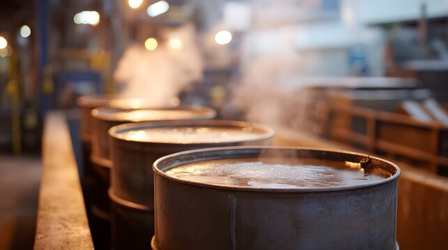 Row of djembes in a workshop, with artisans handcrafting and tuning the drums