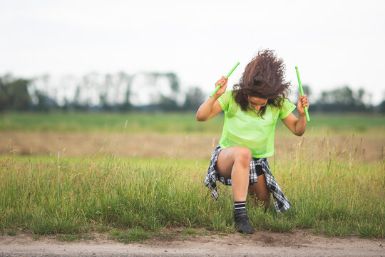 Young woman with tousled hair enjoying while holding drumsticks at field