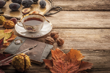 Plums , nuts and leaves with vintage notebook and tea with film filter effect close -up