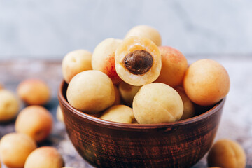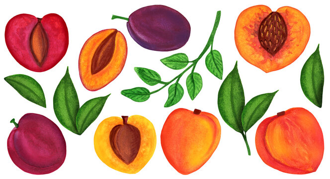 Huge watercolor pit fruit set isolated on white background. Juicy peach, apricot half with pit and damson fruit hand drawn illustration. Garden harvest drupe collection for unique print composition