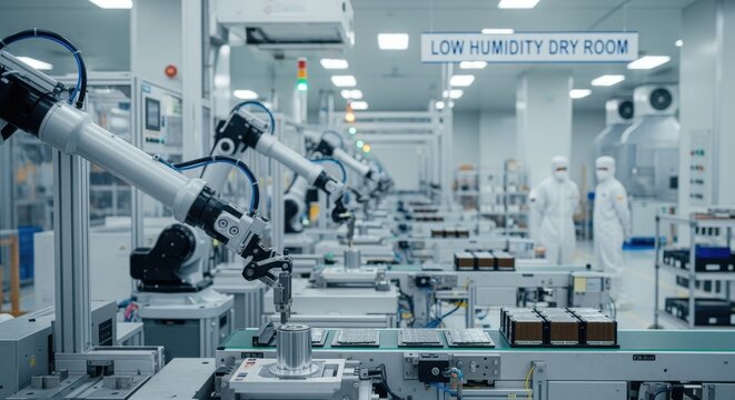 Largescale production line for lithiumion battery cells operating in a lowhumidity dryroom to reduce risk of electrolyte degradation.