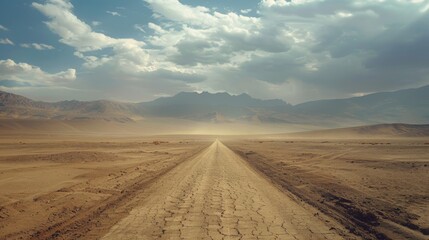 Endless desert road leading to distant mountains under a dramatic sky with scattered clouds. Concept of journey, adventure, and exploration.