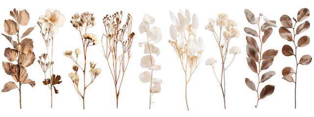 Set with beautiful wild dried meadow flowers isolated on white background.