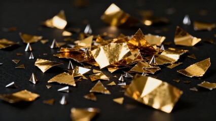 Shimmering golden confetti and metallic spikes scattered on a dark surface, creating a festive and textured visual composition.