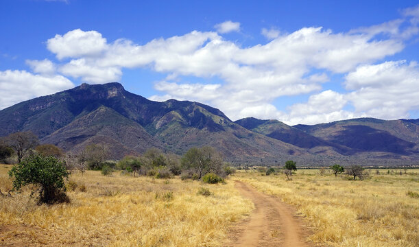 Rough track in the savannah during the dry season with bush and trees in the foreground and a mountain range in the background
