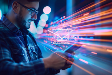 Man Testing Fast Internet Speed on Smartphone in City at Night