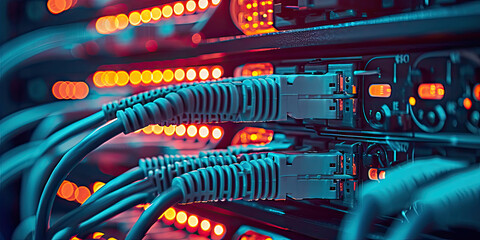 cables and connections for data transfer in the digital world. network cables connected to switch