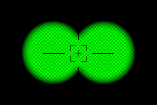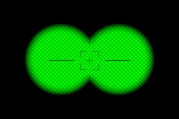 Binoculars viewfinder overlay on transparent background with green night vision effect. Spy POV. Green circular dual lens. Military, hunting optical instrument. Realistic vector illustration.