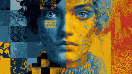 Abstract portrait split face dual tone blue yellow textured pattern mixed media surreal mosaic graphic art conveys introspective mood with contrast and depth in contemporary expressive style