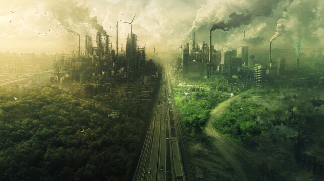 A conceptual split image showing vibrant nature on one side and industrial pollution on the other, emphasizing environmental contrasts. AI generated for ecological themes.