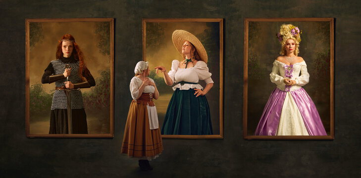 Collage. Portraits in golden frames, warrior, peasant woman, and royal figure, while another peasant figure stands outside frames, looking up at them. Concept of eras, history, comparisons of years