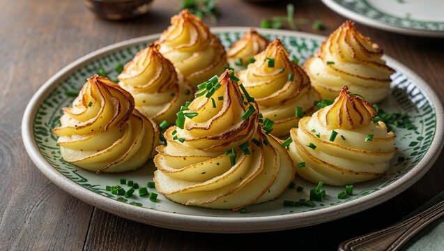 Duchess Potatoes, Elegant Side Dish, Baked Potatoes, Gourmet Food, Party Appetizer, Food Photography, Close Up, Golden Brown, Chives, Plated Food, Festive Meal, Potato Roses