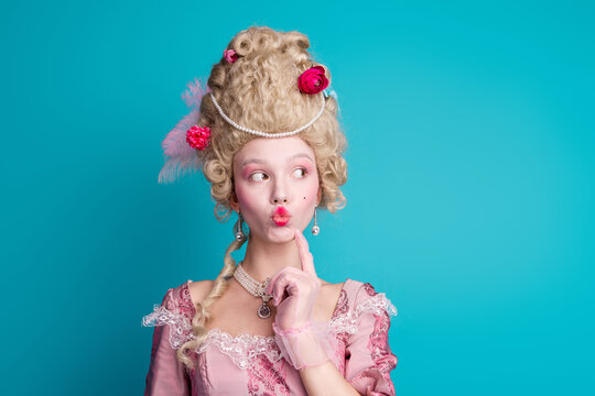 Photo of thoughtful duchess medieval lady hand touch face theater performance isolated on blue color background