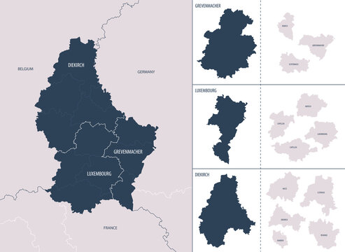 Vector color detailed map of luxembourg with the administrative divisions of the country, each district is presented separately and divided into Cantons