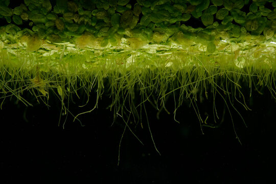 underwater view a group of duckweed floating in glass tank.