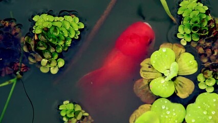 Overhead view of a lionhead goldfish or Carassius auratus swimming to the surface among the floating duckweed