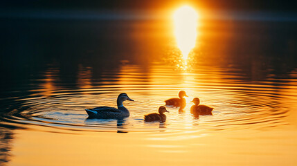 A family of ducks swims across a calm lake near a secluded campsite at dawn. This image portrays the serenity and close connection with wildlife experienced during camping.