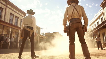 Concept du duel dans le farwest aux Etat-Unis, avec un face à face tragique entre deux cowboys. Ils sont armés de leurs revolver et s’apprêtent à ouvrir le feu.
