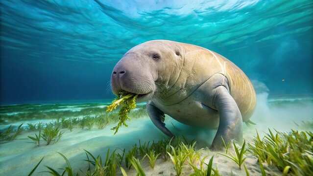 Exploring dugong underwater wildlife photography of sea cow grazing on seagrass ocean marine life animal photo