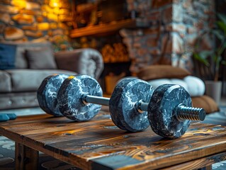 A pair of dumbbells sit on a wooden table in front of a fireplace.