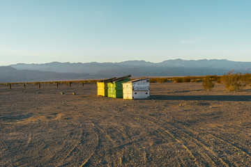 Row of black metal construction dumpsters parked on asphalt. Blue truck visible on left. Bright sunny day with green trees and blue sky. Ideal for renovation, waste management, demolition projects.