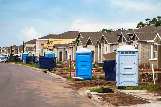Street view of single-family houses under construction, with dumpsters and portable sanitation units near the curb, in a suburban development in Florida. Digital oil-painting effect.